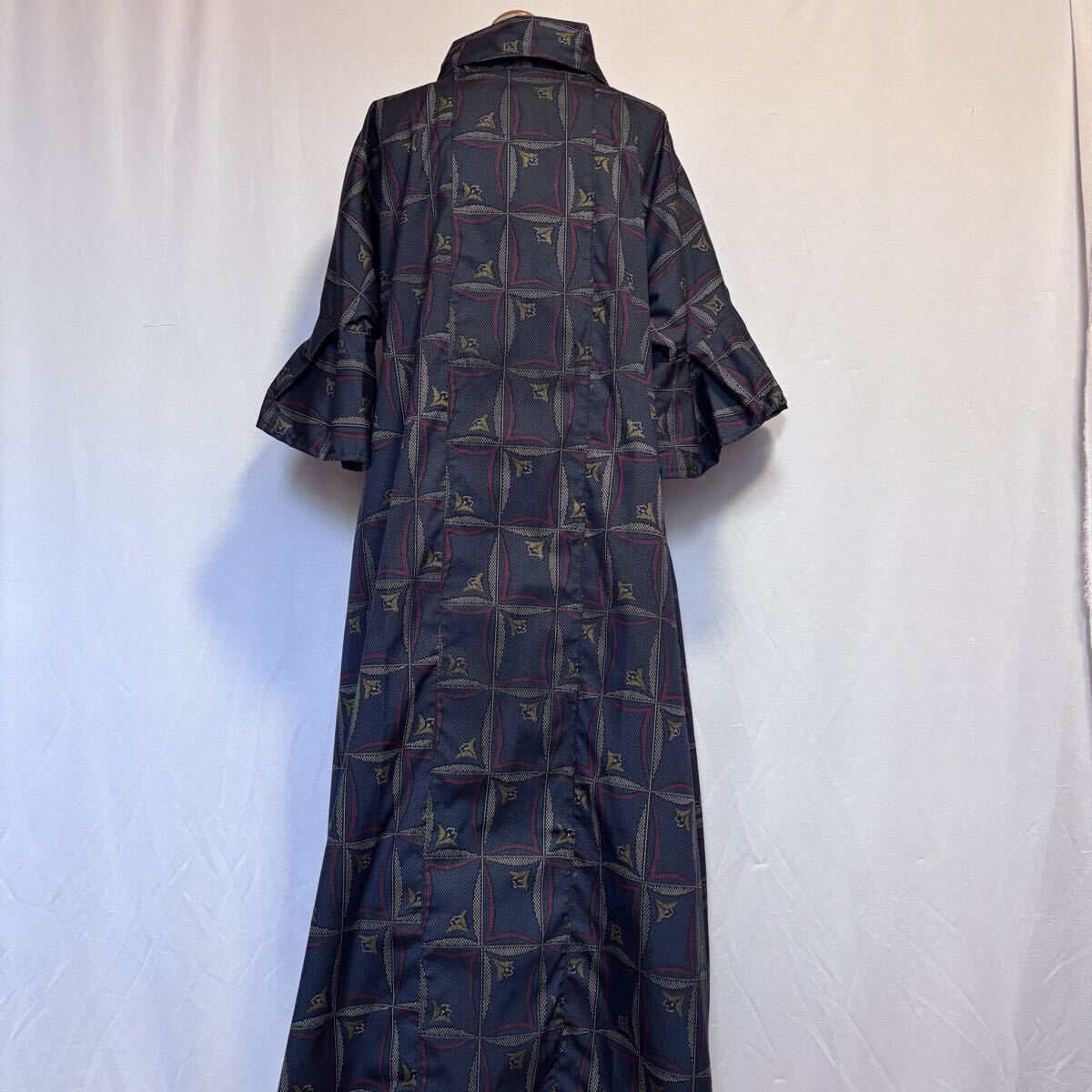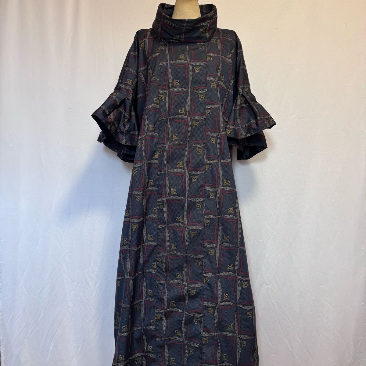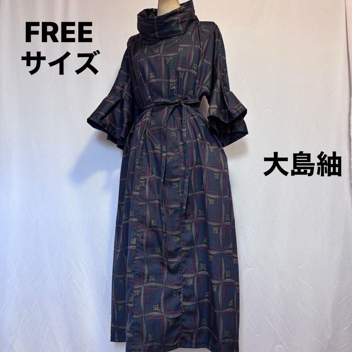 ★80★紺エンジ色大島紬ロールカラー袖口フリルドルマンスリーブロングワンピース★FREE★正絹