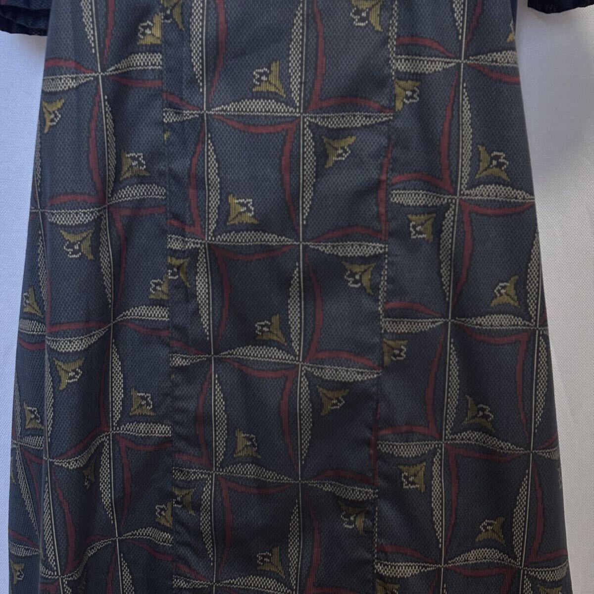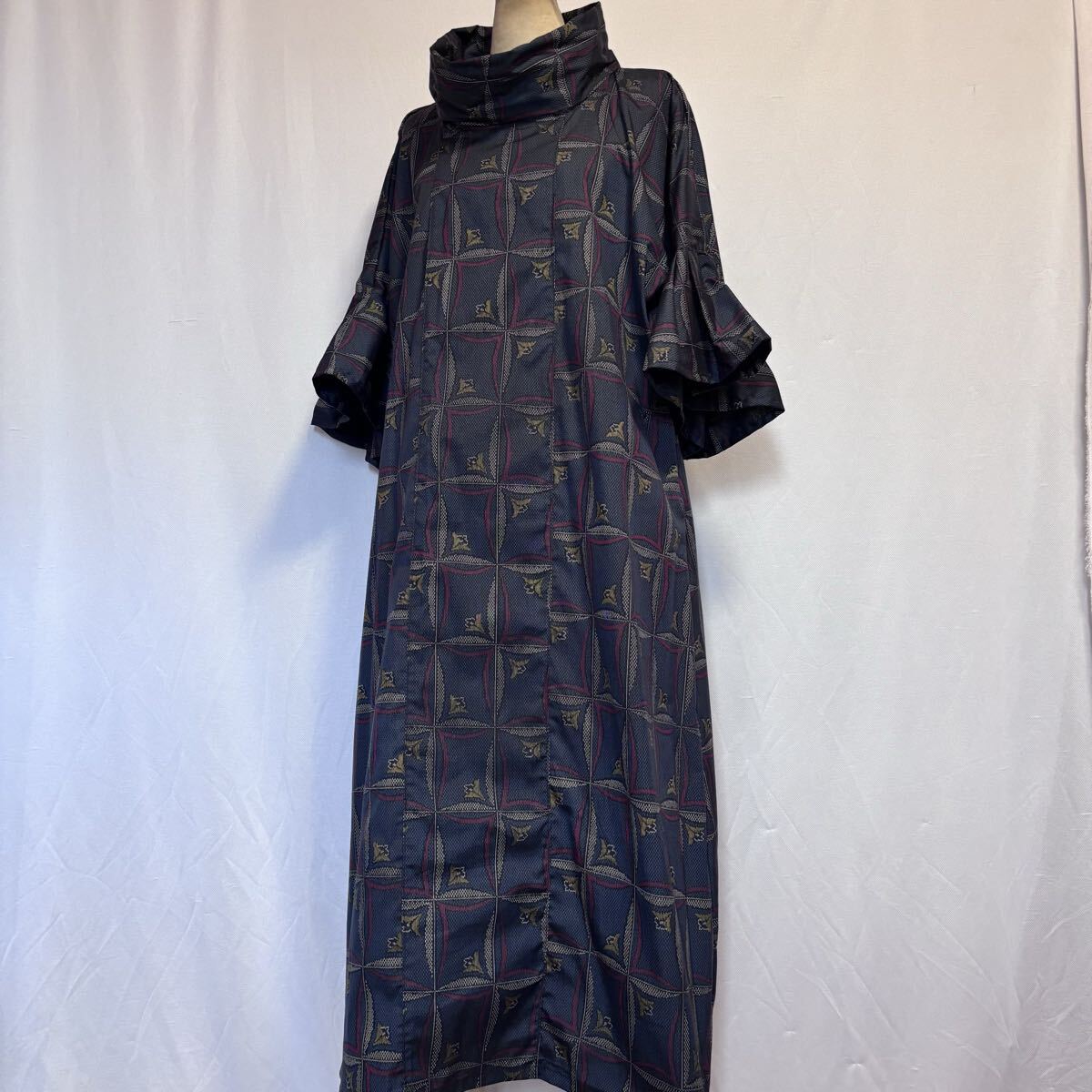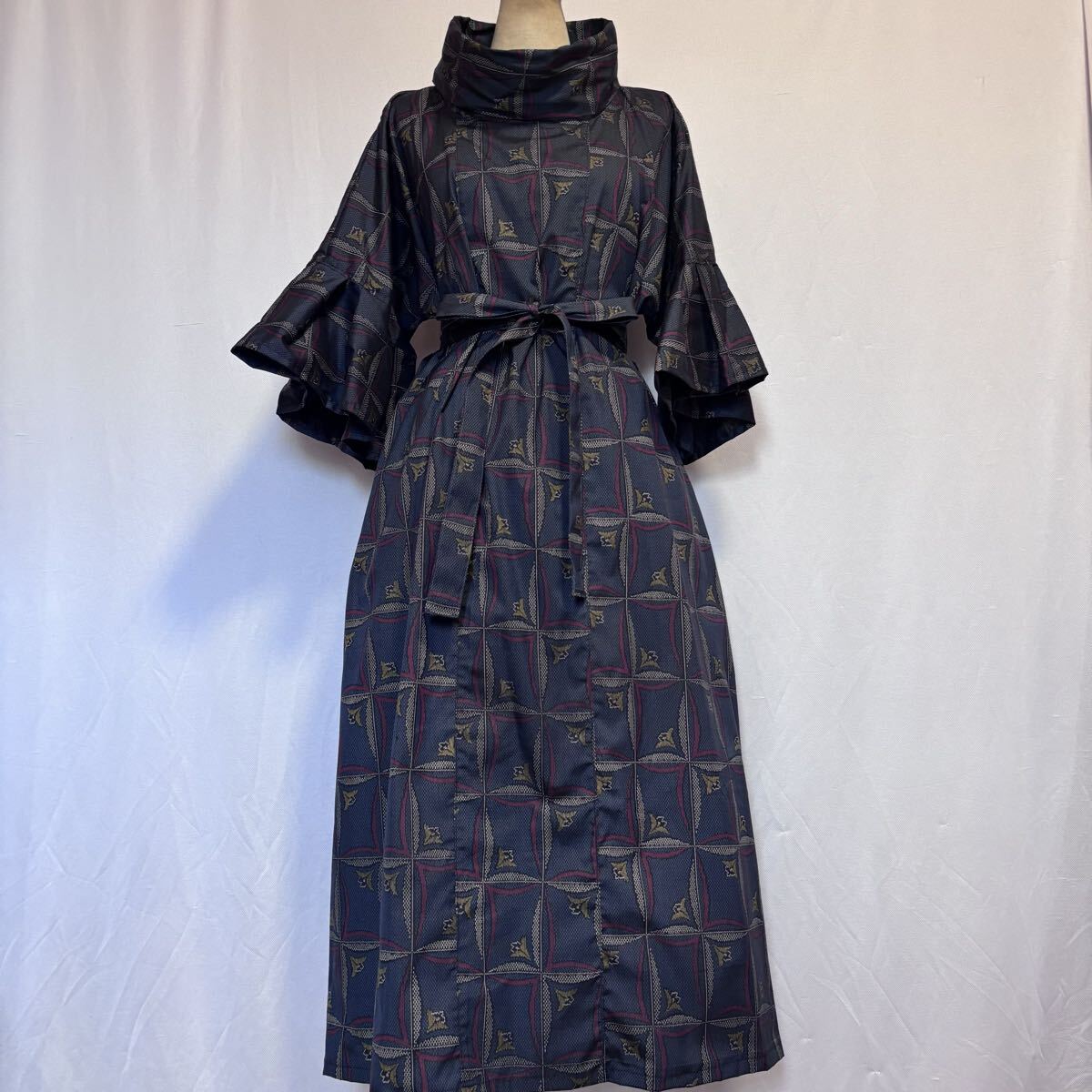 Product name: 着物リメイク★80★紺エンジ色系大島紬オフタートル袖口フリルドルマンスリーブワンピース★FREE★正絹