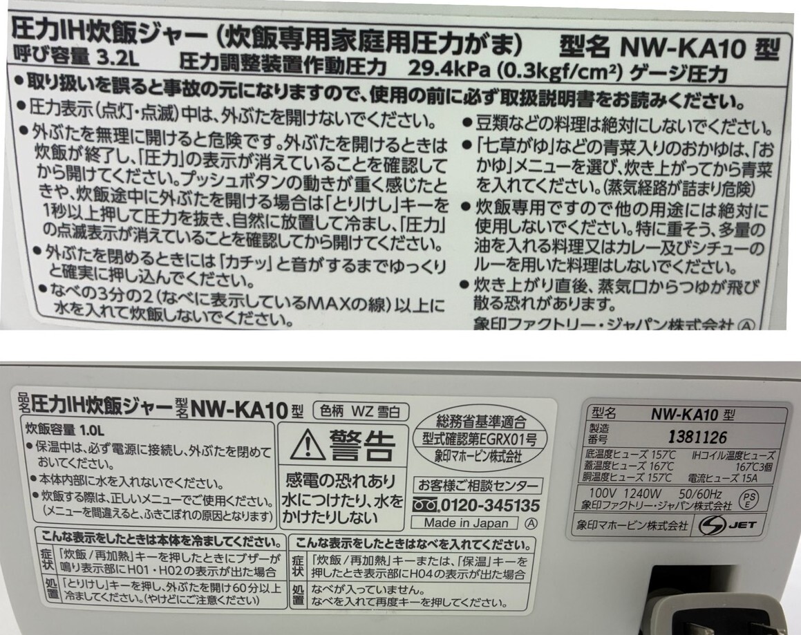 Product name: ZOJIRUSHI NW-KA10圧力IH炊飯ジャー 炎舞炊き 中古品一台 SA-0787