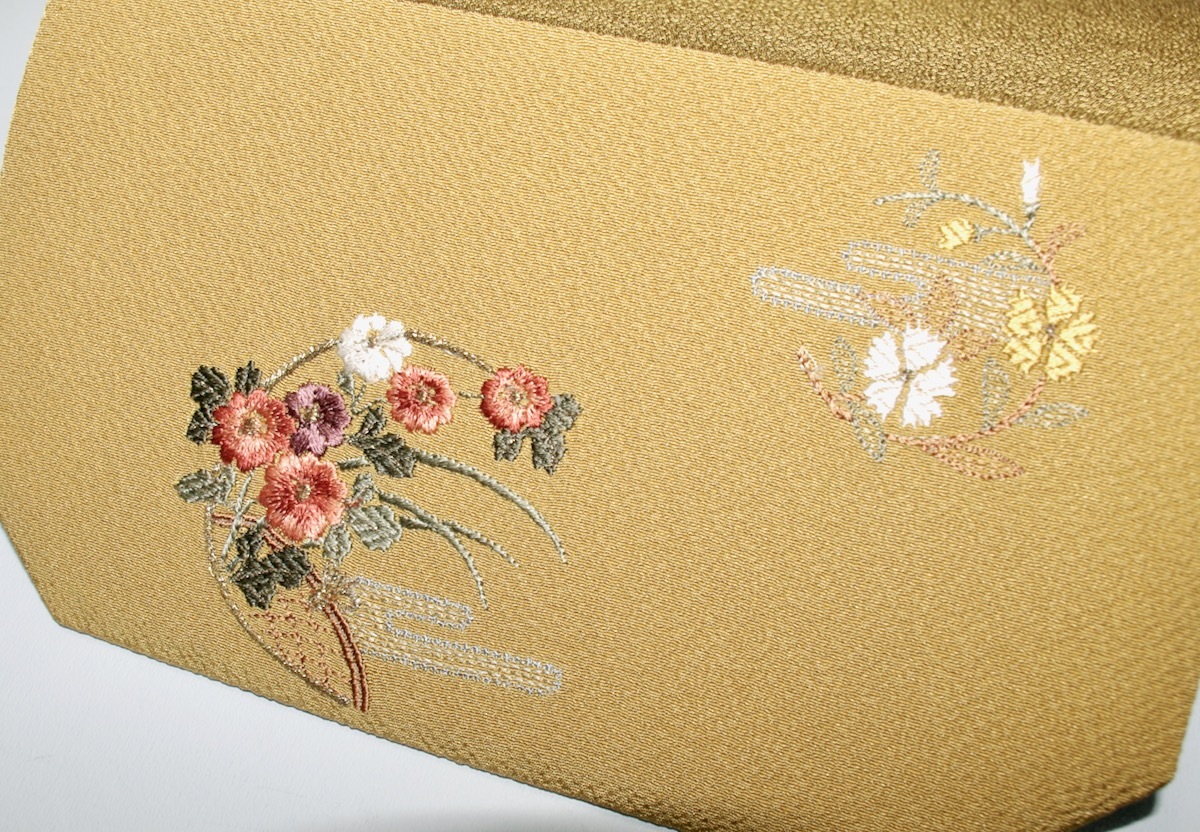 辛子色系に刺繍の菊とナデシコの花丸文がお洒落な通帳札入れです。