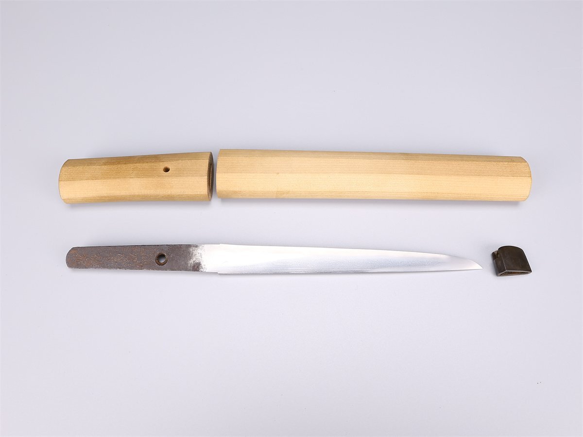 総重量 123g、刀身重 63g、拵全長 27cm、柄長 8.2cm、刃渡り 15.1cm、反り 0cm、元幅 1.7cm、先幅 0.9cm、元重 0.5cm、先重 0.3cm。