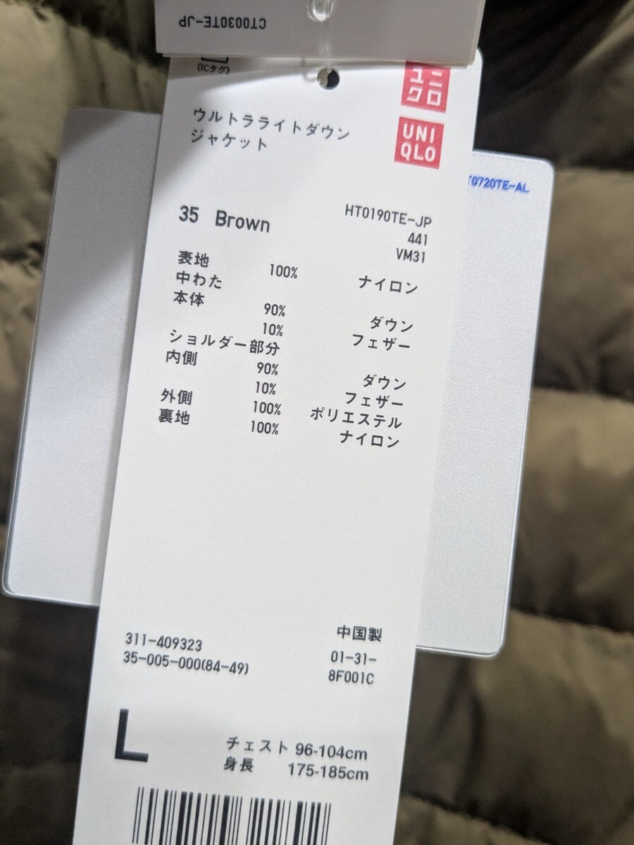 新品未使用 ユニクロ ウルトラライトダウンジャケット ブラウン L UNIQLO ダウンジャケット