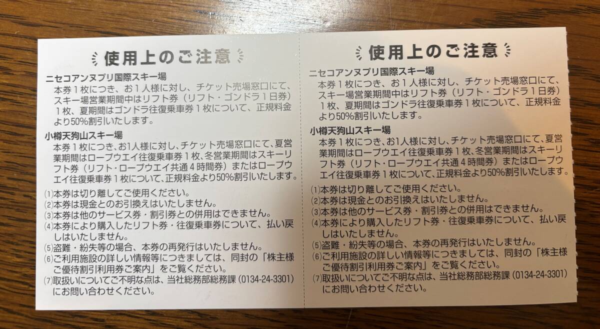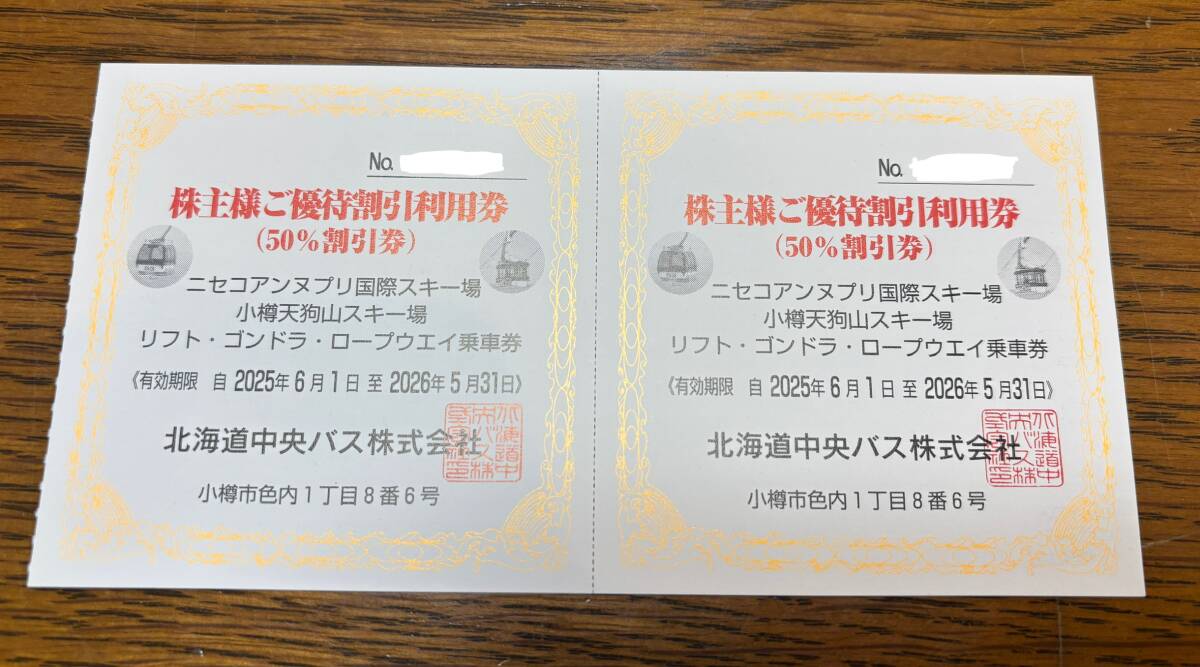 北海道中央バス 株主様ご優待割引利用券 50%割引券 2枚 ニセコアンヌプリ国際スキー場 小樽天狗山スキー場 有効期限2026年5月31日