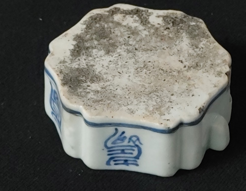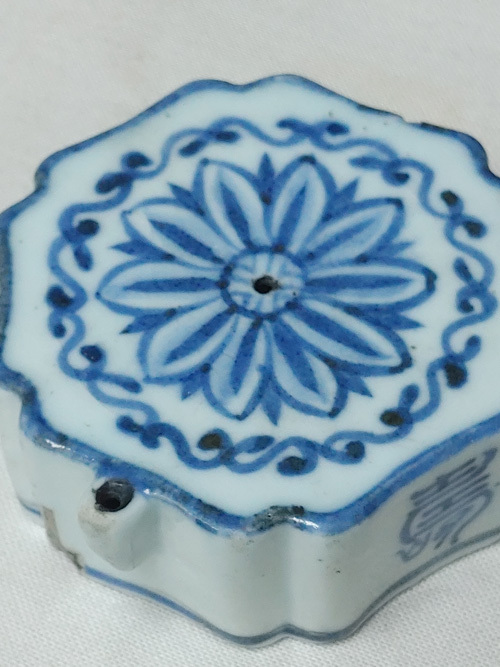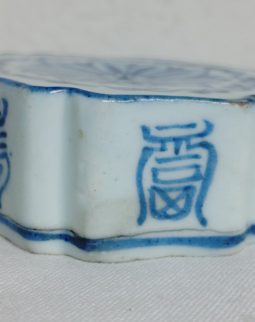 李朝期分院窯産 白磁 染付け 側面に富と寿の吉祥文字 天面に連弁文 力強い面取り 柔らかな白磁色 花形12面取り 大型水滴 ③ 検初期伊万里