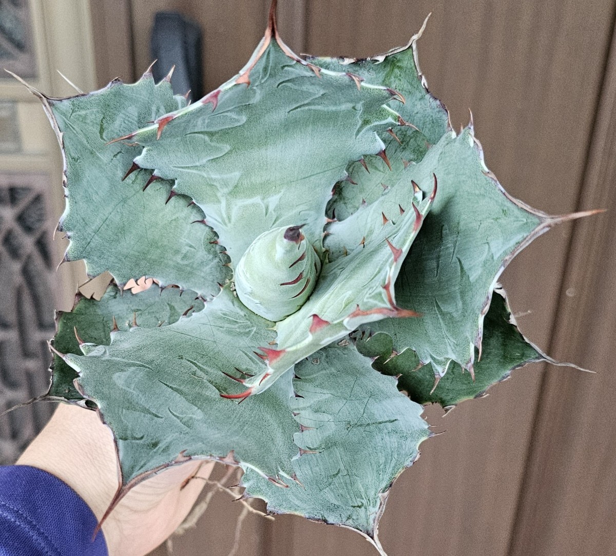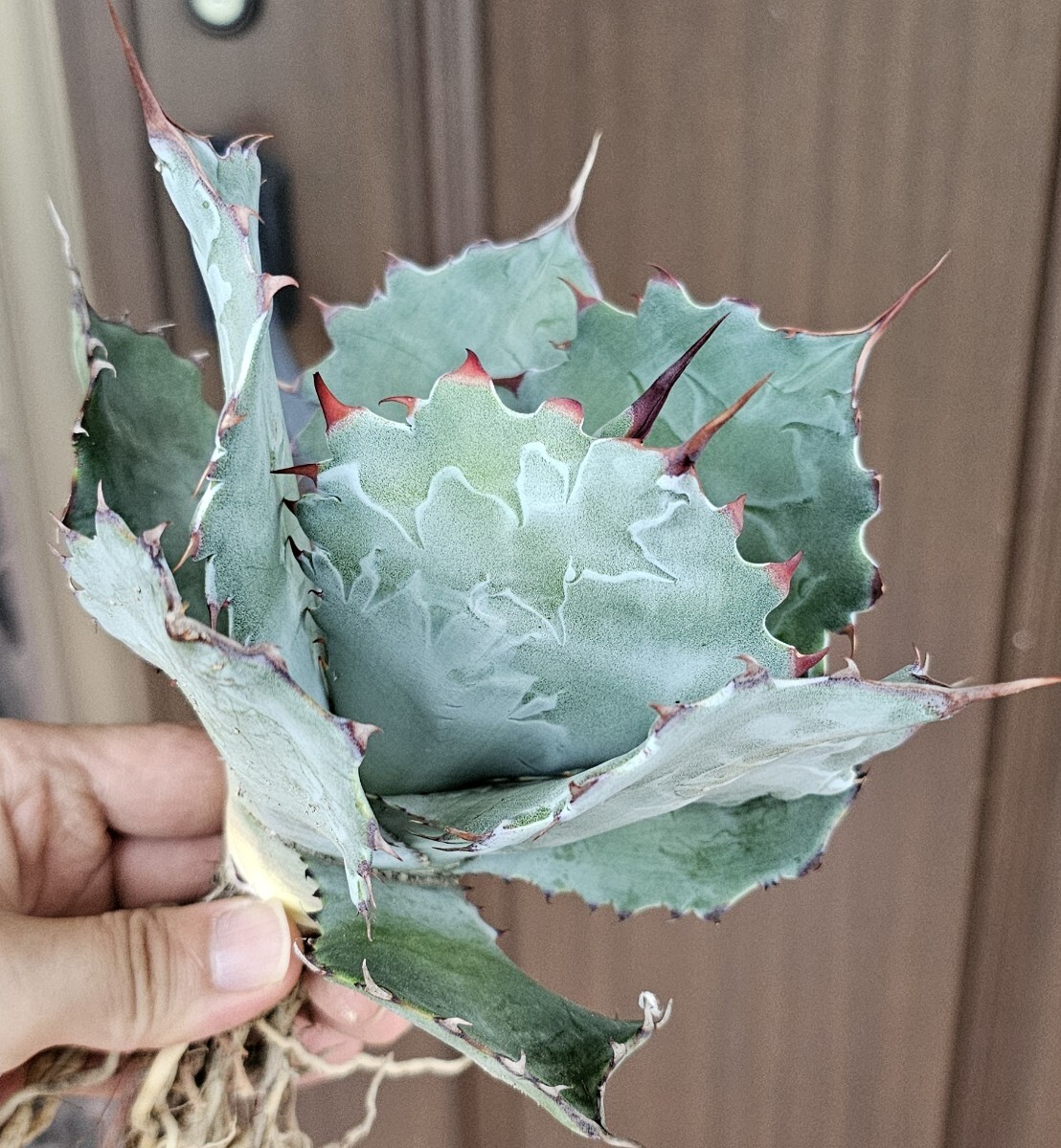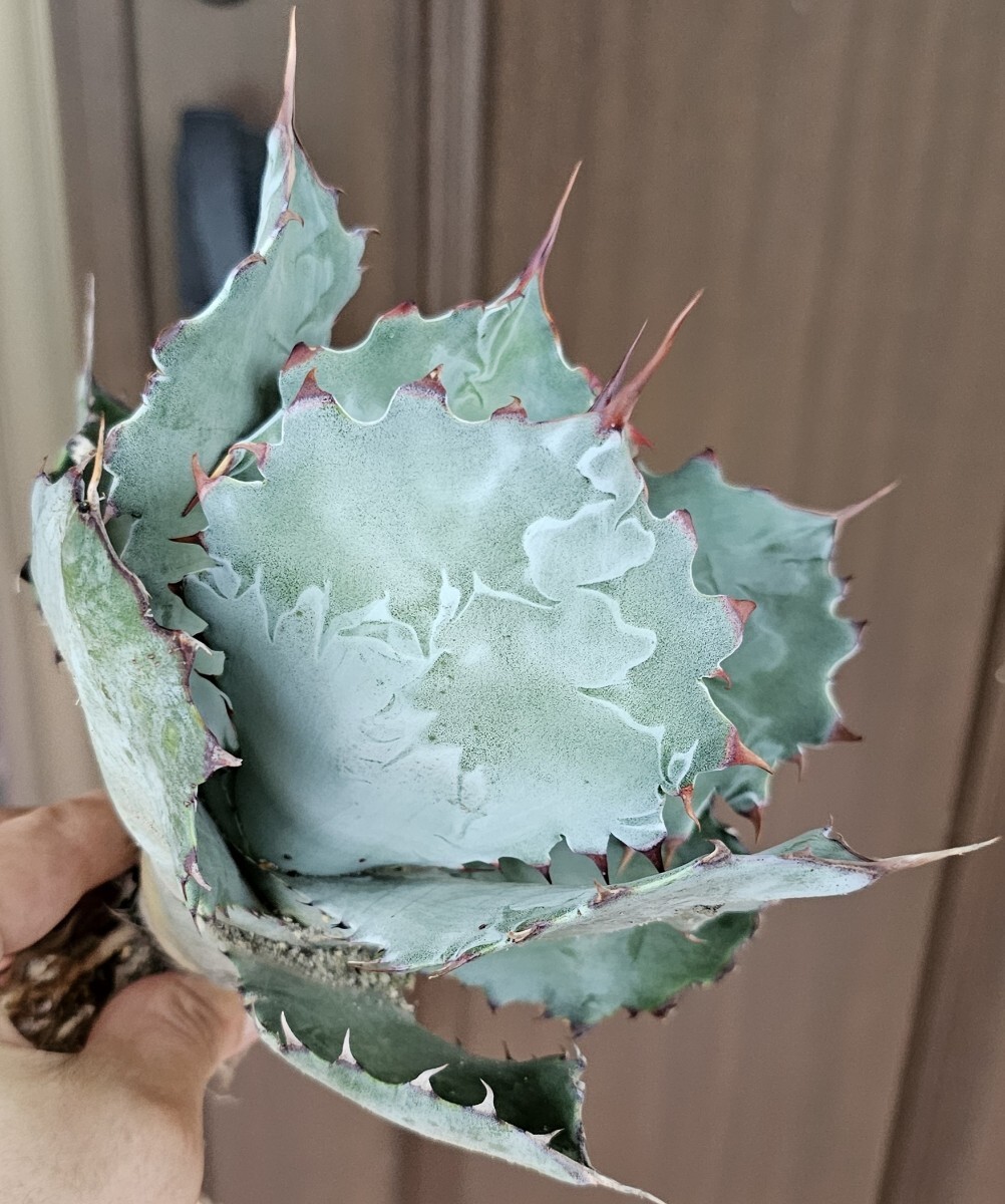 コロラータ×グアダラハラ。青さ、葉の幅、ウォーターマーク全てが魅力的で迫力があります。刺も強く連なっている部分もあります。日本にあまり入ってきておりません。直径18cm。