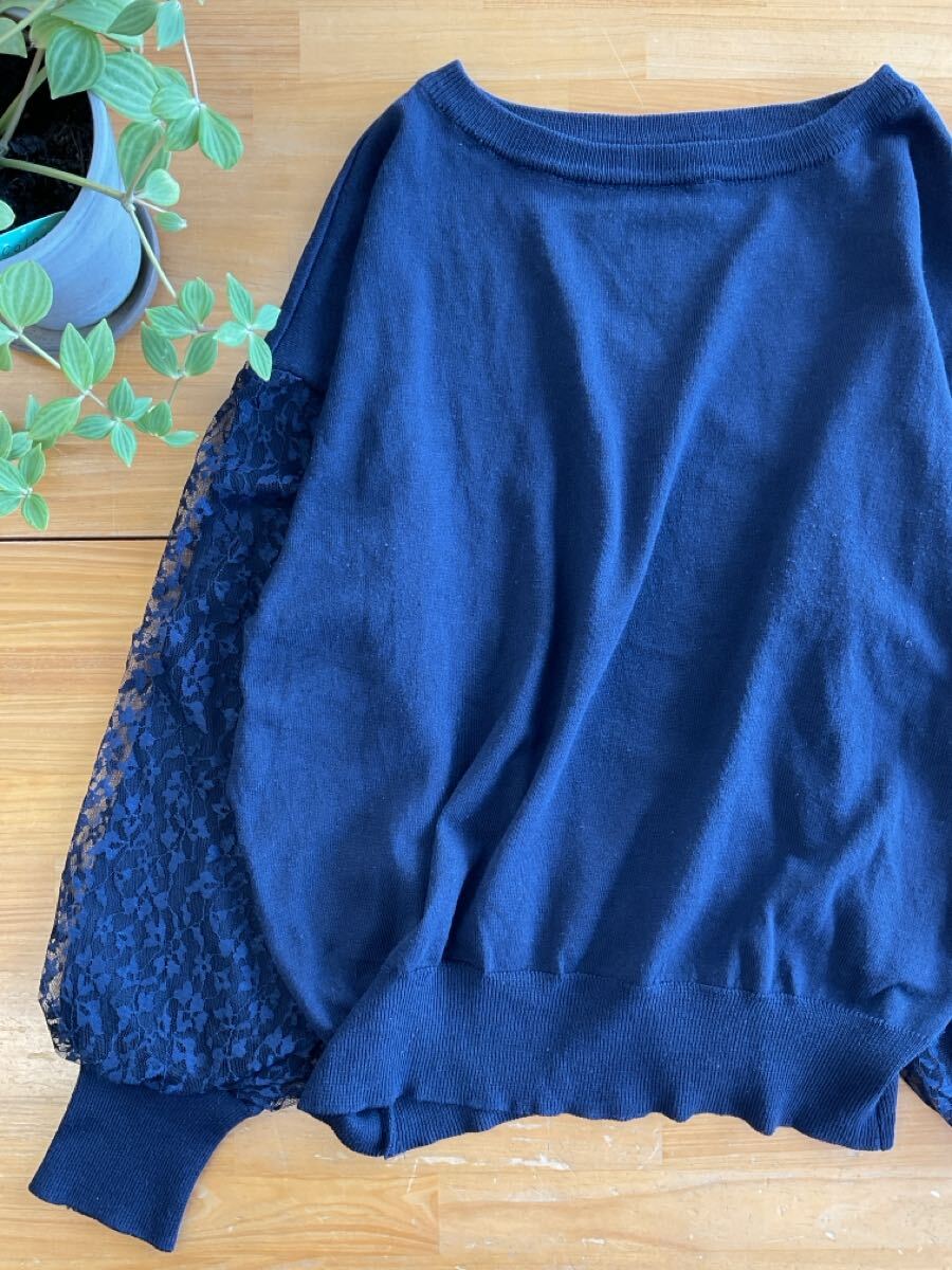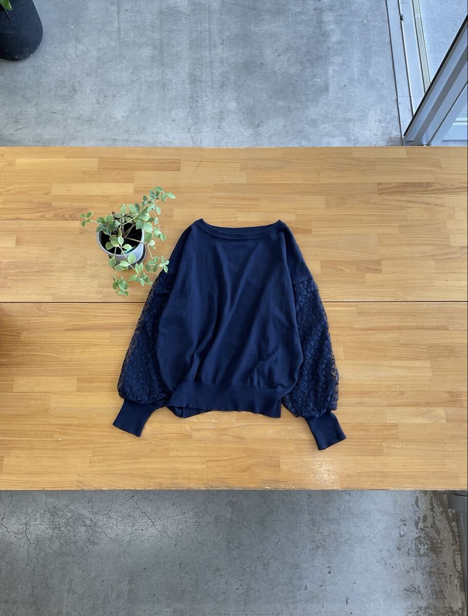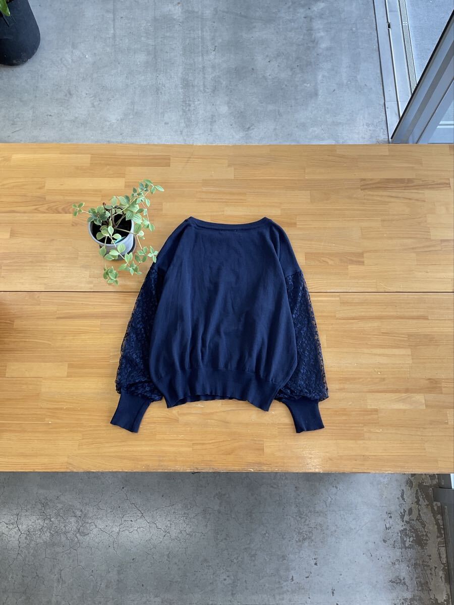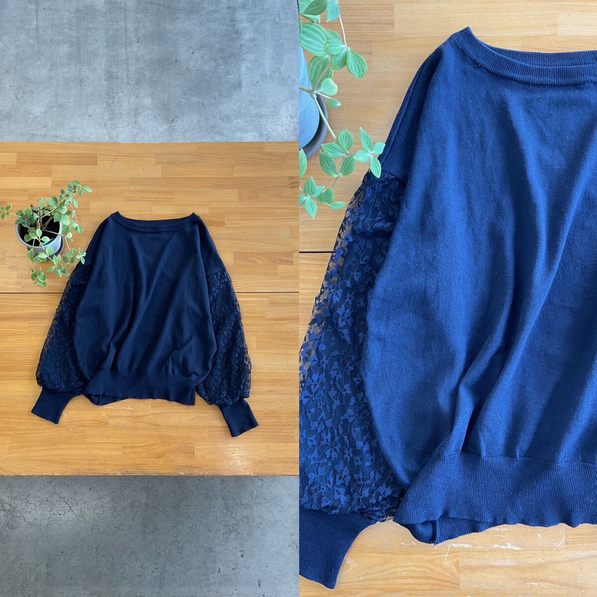 Product name: Te chichi テチチ パフスリーブ花柄レースニットトップス 裾リブ袖コンシャスクルーネックきれいめセーター ネイビー紺色系 フリー q