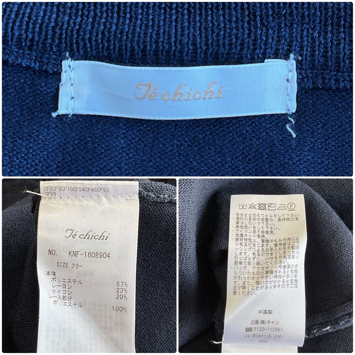 Te chichi テチチ パフスリーブ花柄レースニットトップス 裾リブ袖コンシャスクルーネックきれいめセーター ネイビー紺色系 フリー q