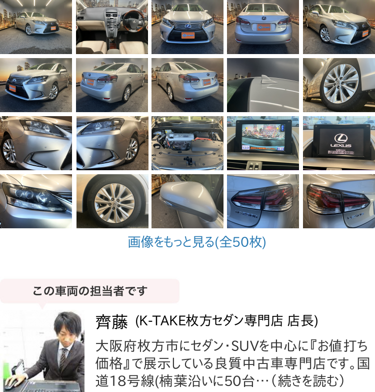 K-TAKE枚方店は国産セダン・SUV・ステーションワゴンを中心に取り扱いしております。趣向性の高い車種になりますので、専門知識を持ったスタッフにてご案内させて頂きます。コーティングやカスタム等はもちろん、任意保険、オートローンまで安心のカーライフをお約束致します。整備、保証などのアフターサービスも当店ですべて行えますのでご安心ください。当社は全国のオークション会場、約160カ所と業務提携を結んでおります。全国60000台以上の中古車を当店でご商談、ご契約、ご納車可能です!