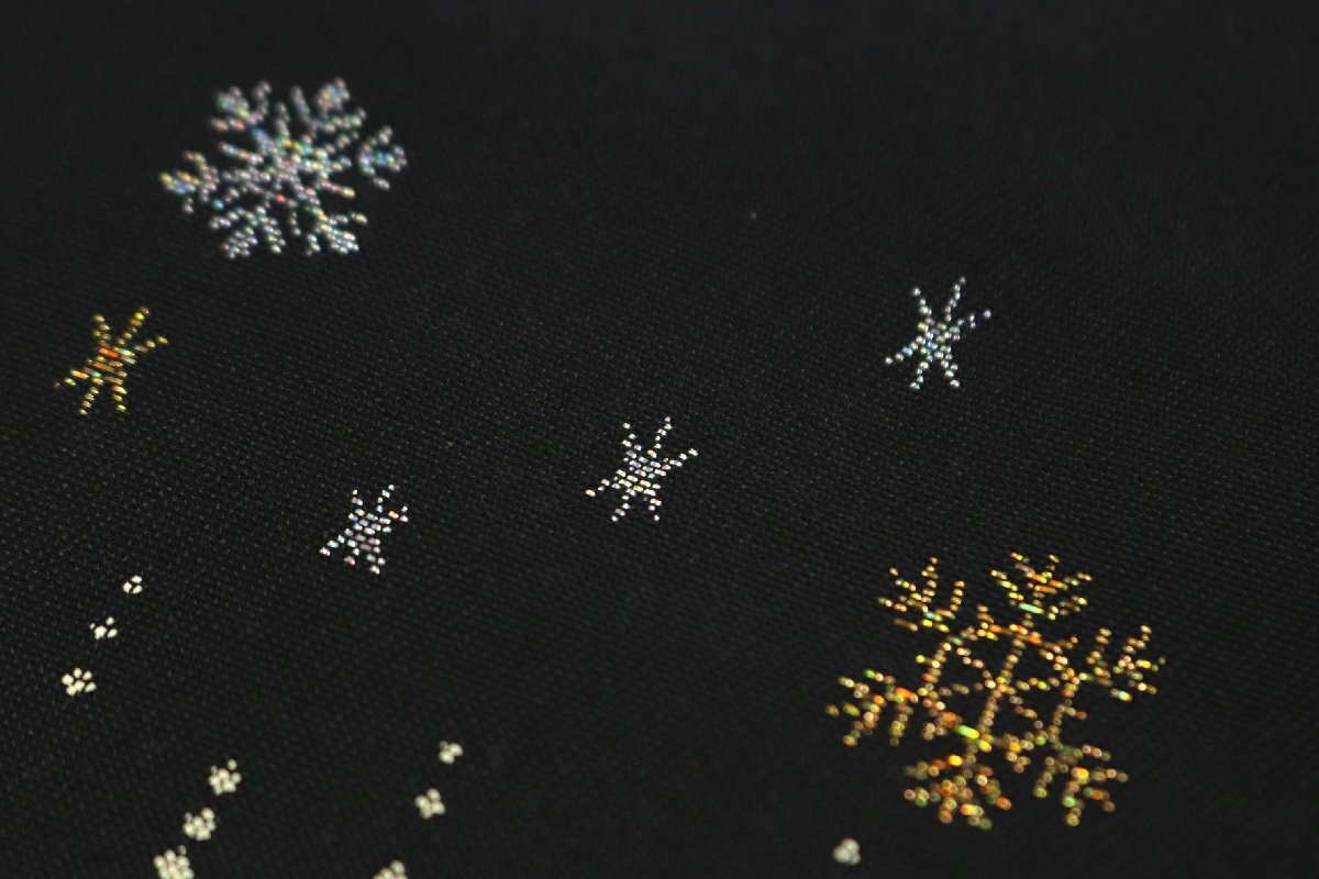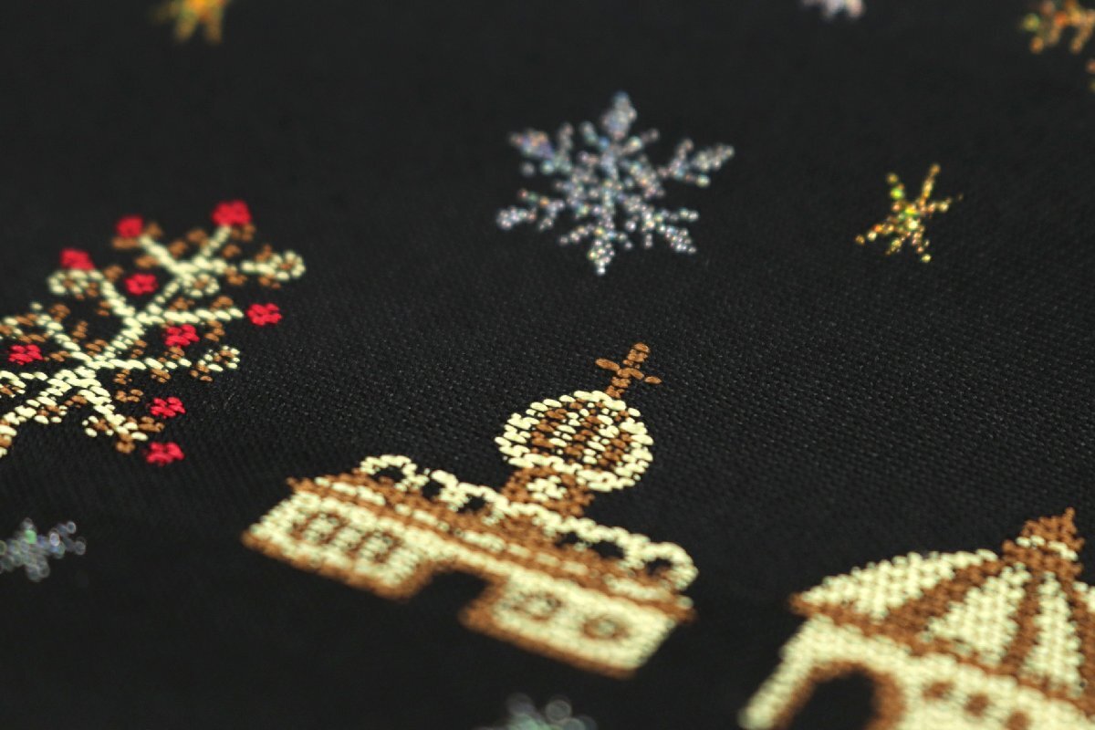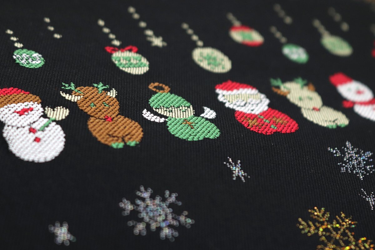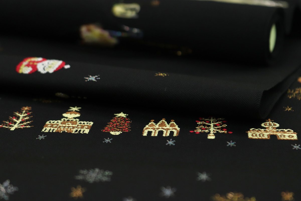 ややハリのある帯地は、黒色でございます。 白色や緑色、赤色、茶色、生成り色のお色目の糸で、サンタクロースや雪だるま、天使、トナカイ、オーナメント、雪の結晶、教会などがボーダー状に織り上げられております。 小さめの柄が並んで配されており、可愛らしい印象でございます。楽しげなクリスマスを思わせる素敵な柄行きでございます。パーティーにいかがでしょうか。