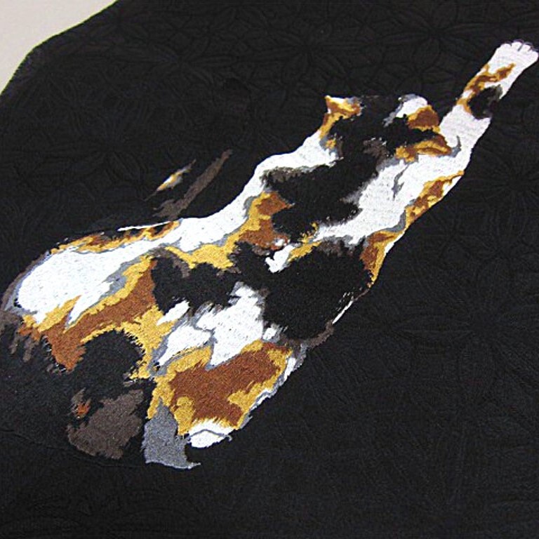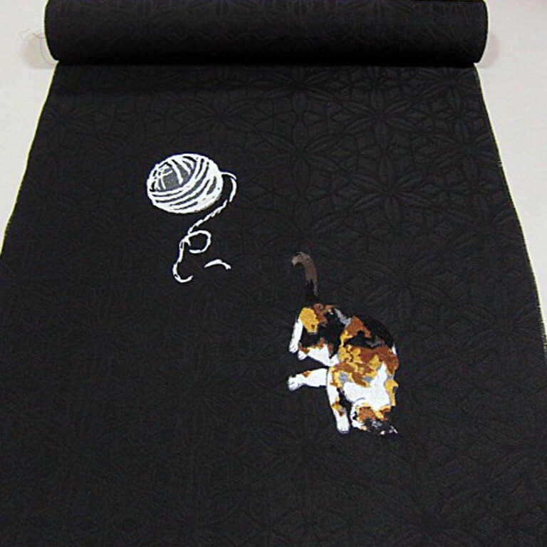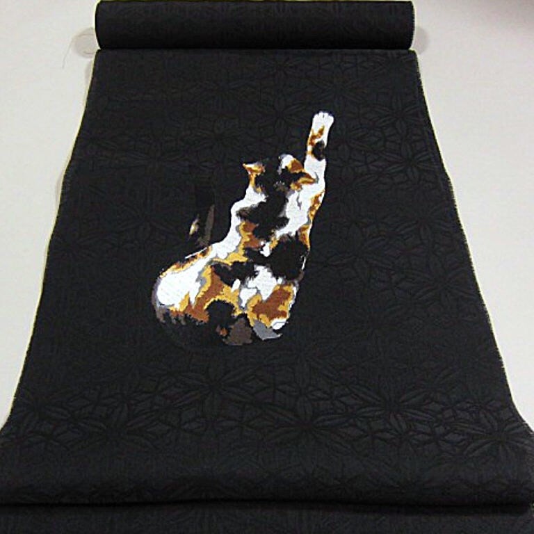 新品未仕立 西陣織九寸名古屋帯 です。 黒のお色目の帯地に三毛猫の意匠が刺繍で表現されております。お食事会・お出かけなどにいかがでしょうか。織り上がったばかりのお品です