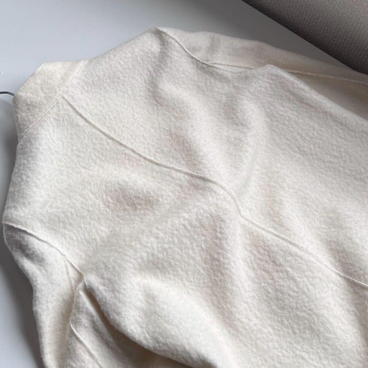 丁寧な ダブルフェイス 仕立てにより、裏地がなくても美しく軽やか。クチートアマーノ のようなふんわりとした軽い着心地は、まさに 羽織るだけで洗練される一着 です。フロントにはモダンなデザインボタンをあしらい、シンプルながらもディテールにこだわった佇まい。さっと羽織るだけで、コーディネートを上品にまとめてくれます。