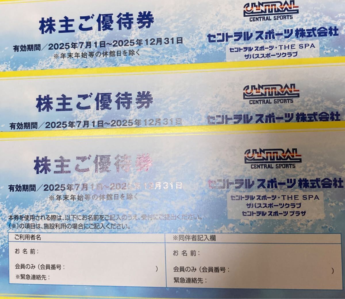 Product name: フィットネスクラブ セントラルスポーツ 株主ご優待券 3枚セット 有効期限 2025年12月31日