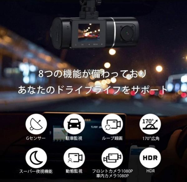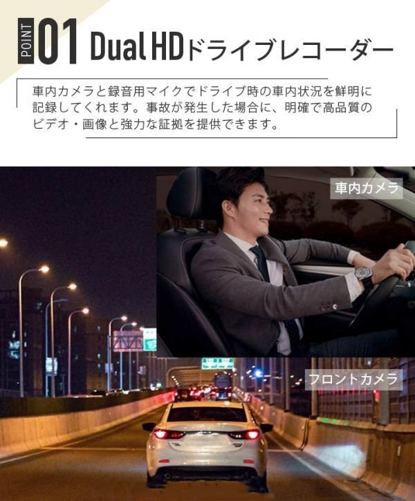 前後カメラ デュアル1080pフルHD:フロントカメラ1920×1080P/30FPS、車内カメラ1920×1080P/30FPSで同時に録画します。車内カメラと録音用マイクでドライブ時の車内状況を鮮明に記録できます。