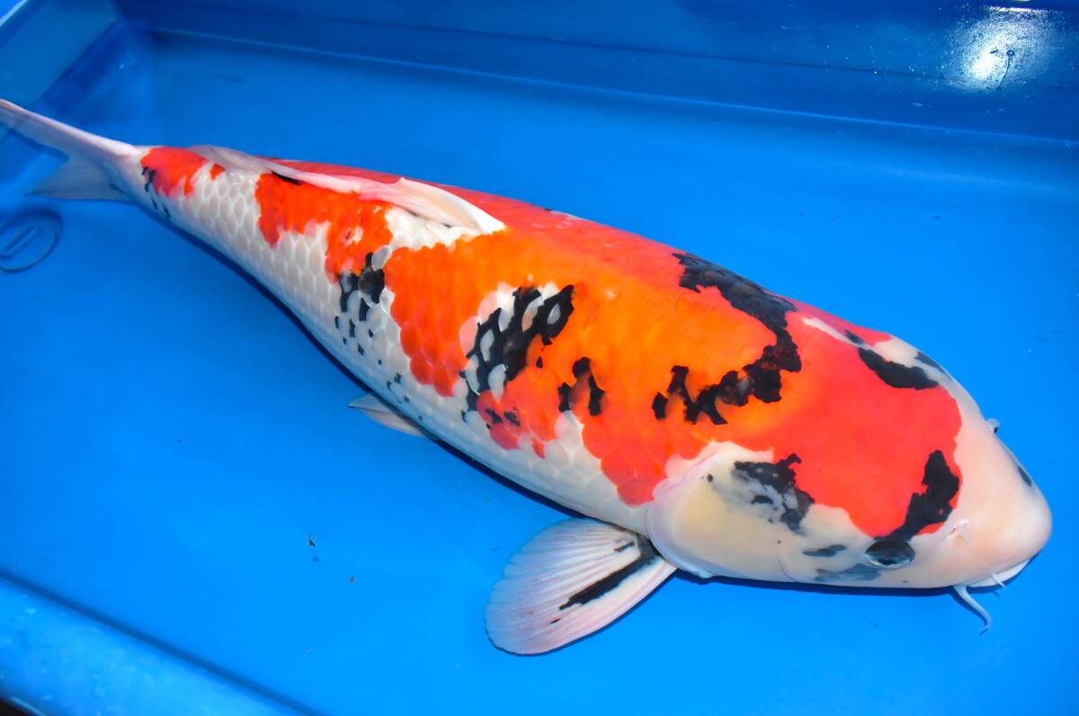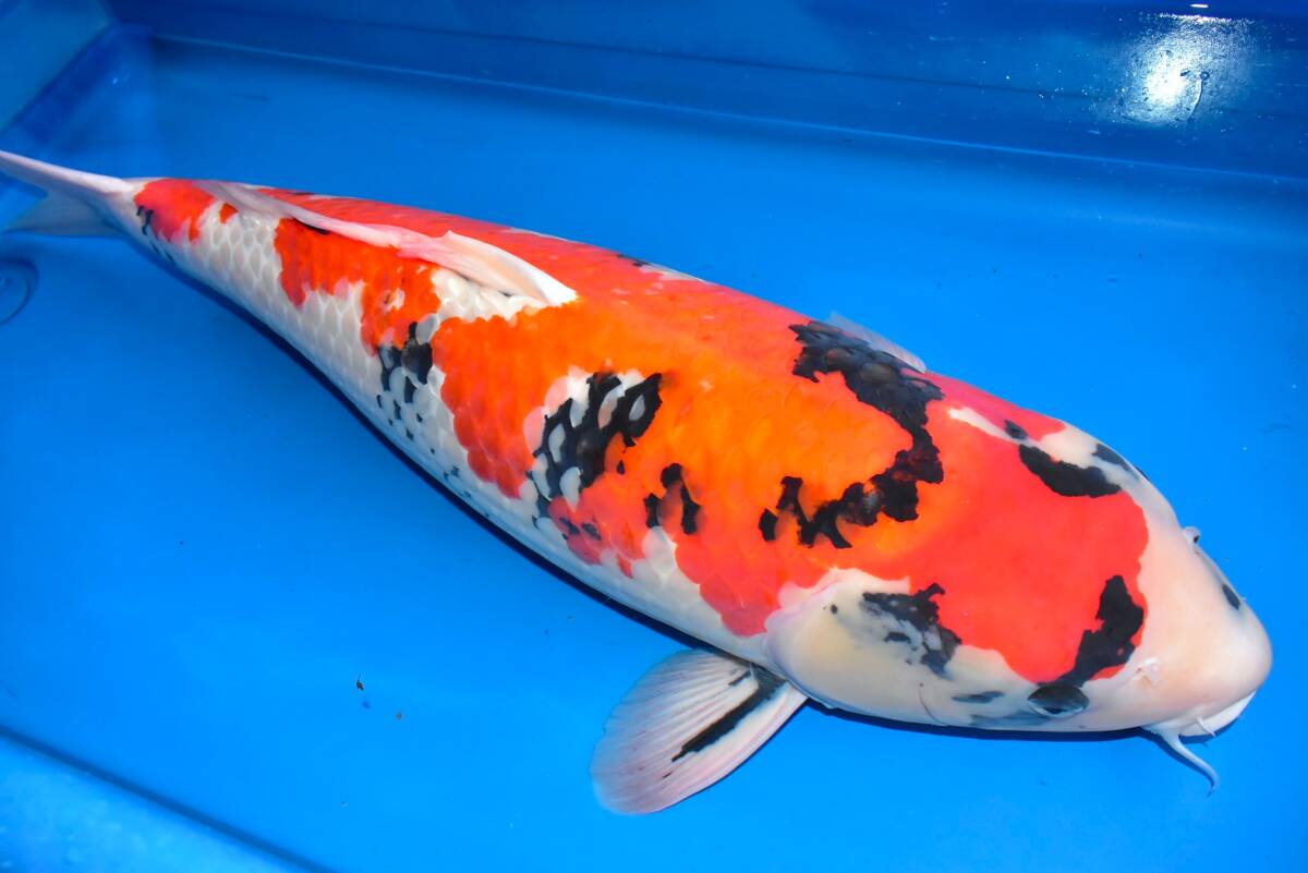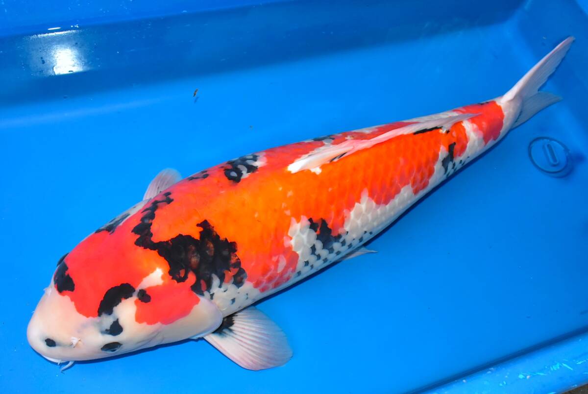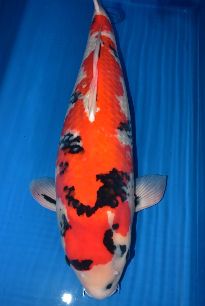 この鯉は、上野養魚場産 昭和三色 7歳 (2019年産) 84cm メスです。
