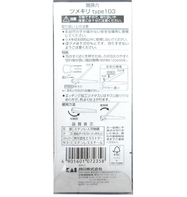 内 容 ■貝印 関孫六 ツメキリ type103(HC-3551)