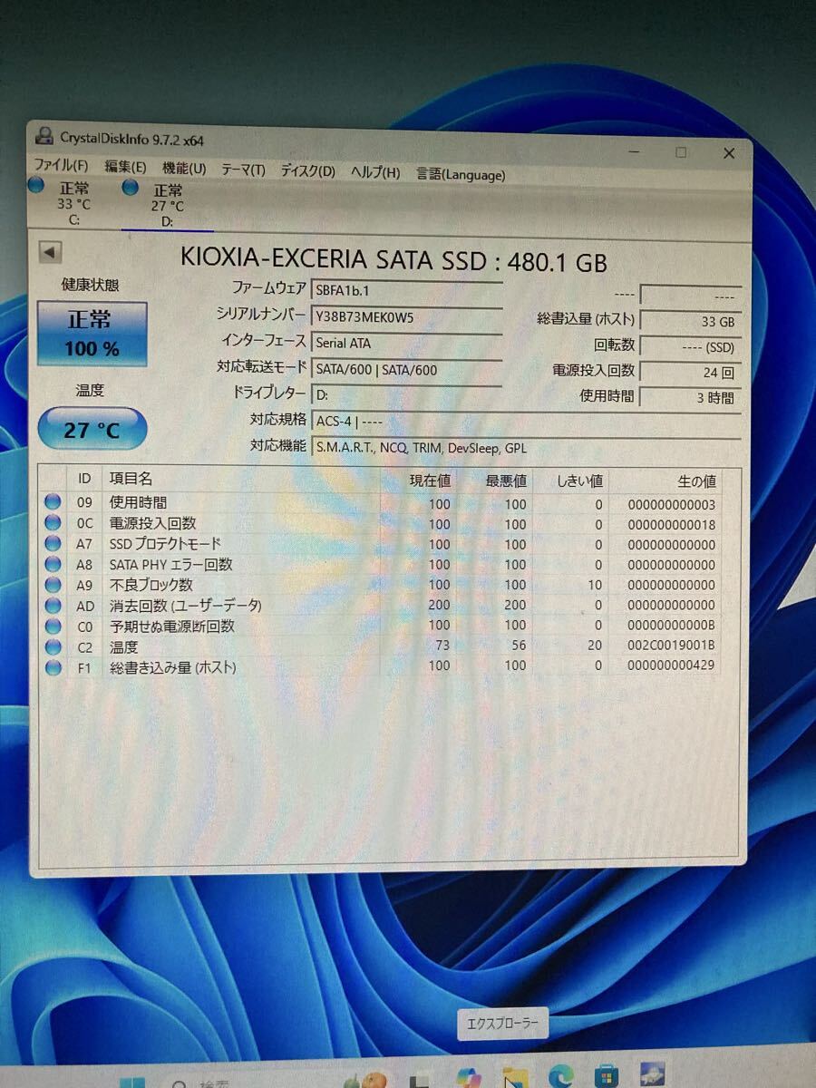 【美品】使用3時間 KIOXIA EXCERIA SSD SATA 480GB 薄型7mm/ほぼ新品