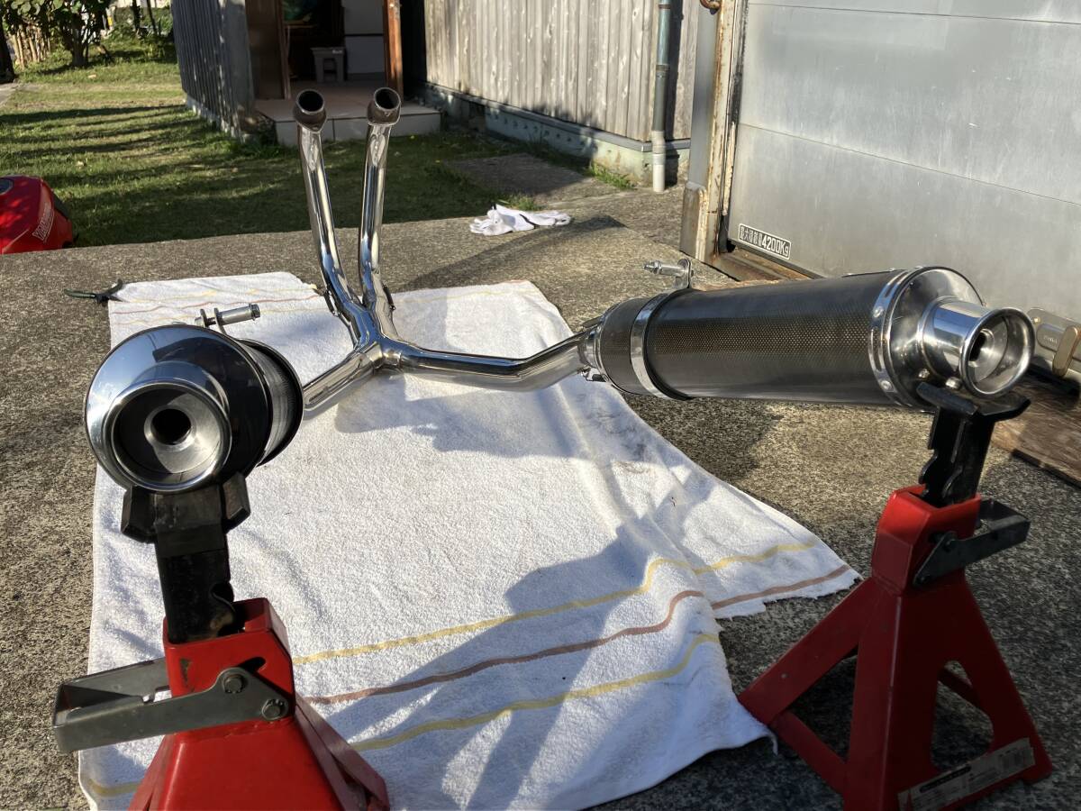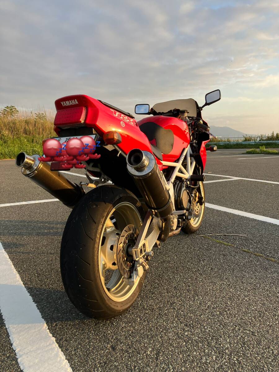 ご覧いただきありがとうございます。TRX850社外マフラー加工有りの出品です。YZR750SP用スイングアーム取り付けの為、サイレンサー取り付接合部に加工が有ります。