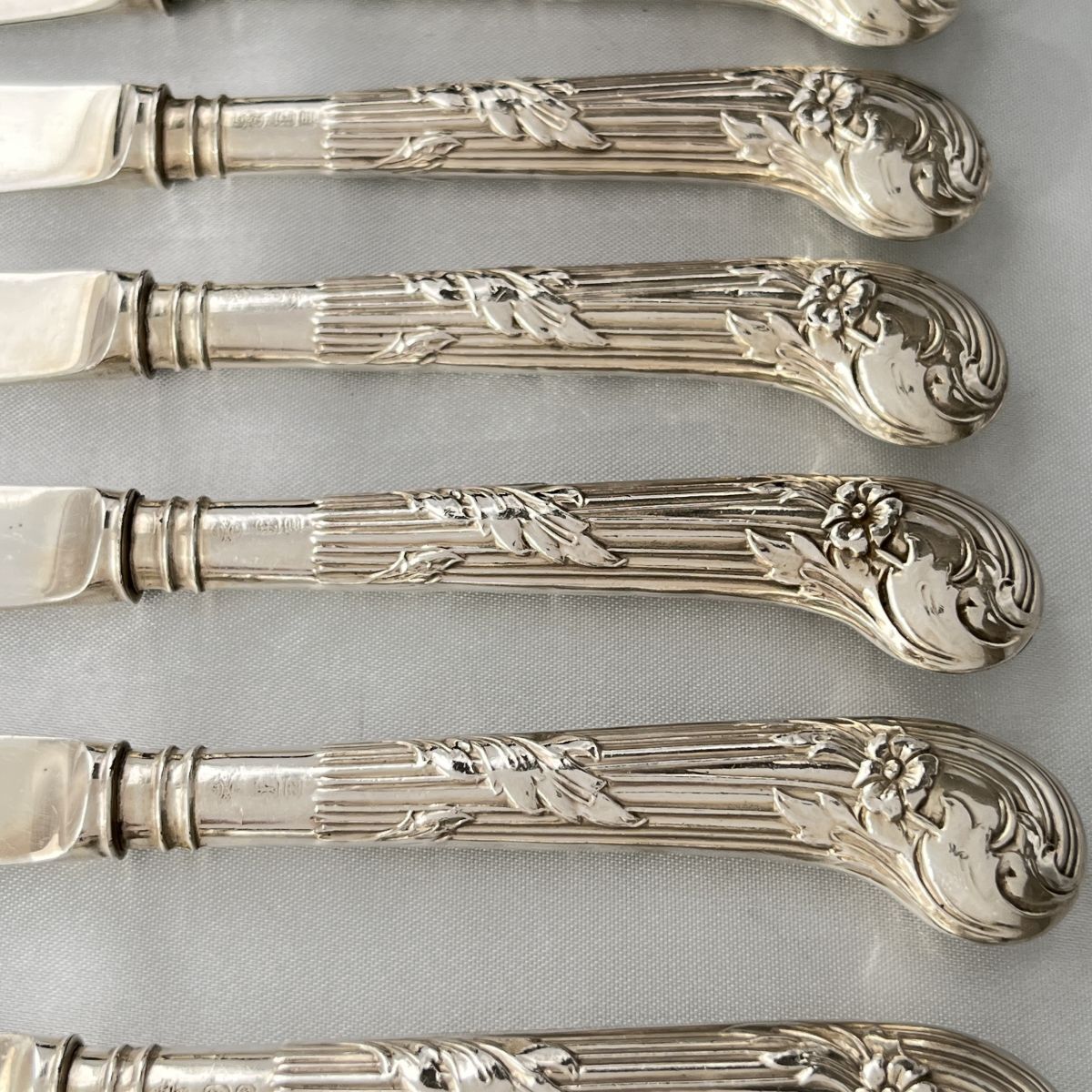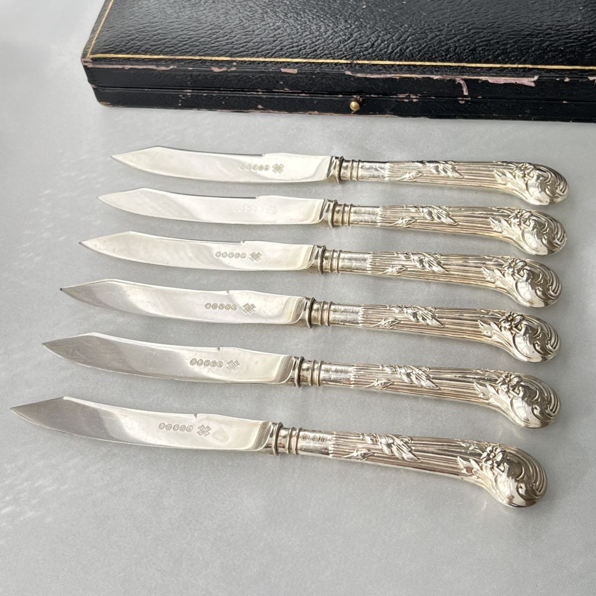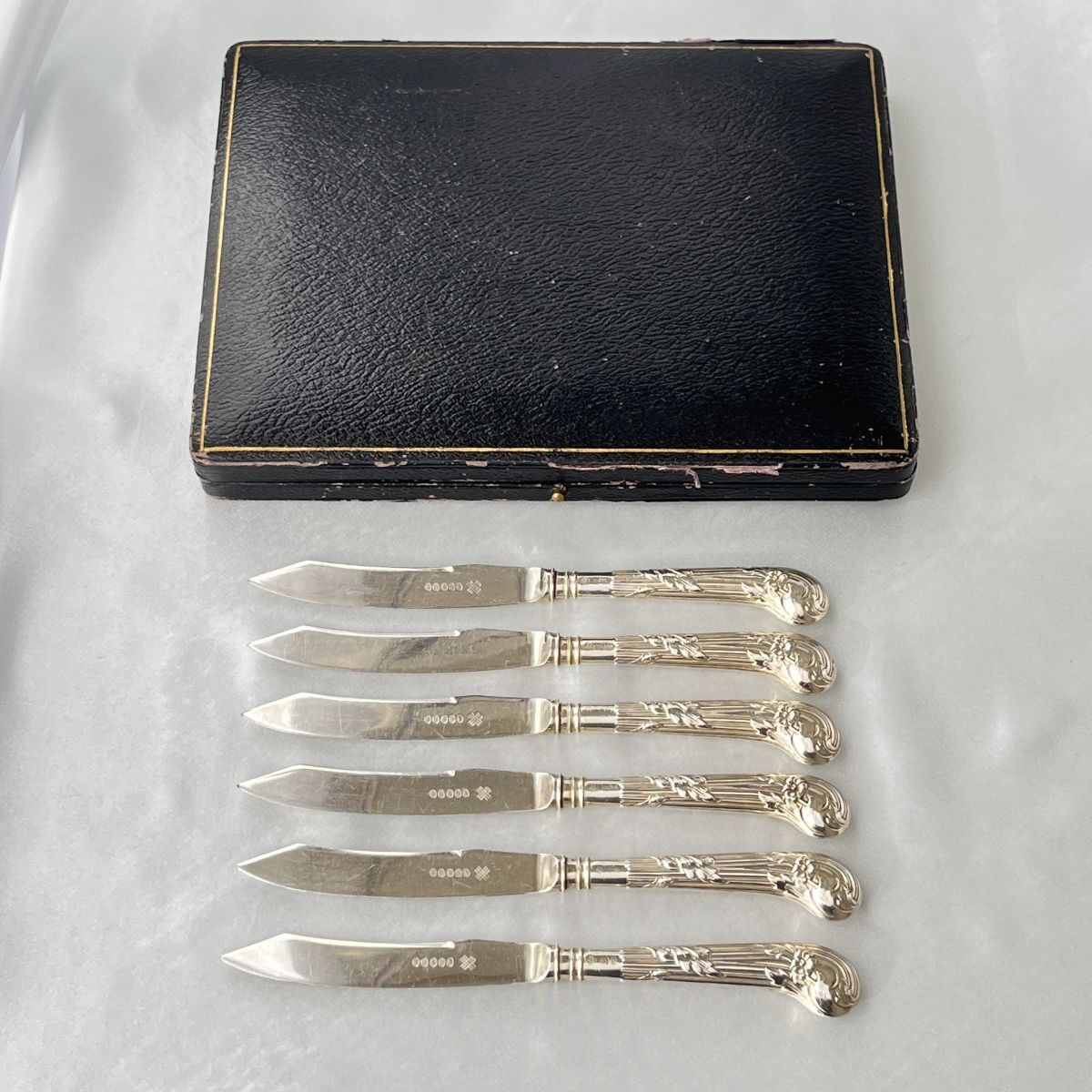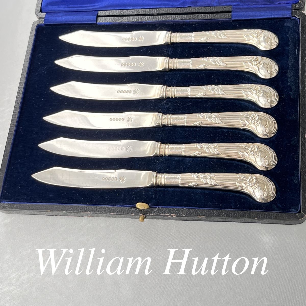 【William Hutton & Sons Ltd】 【純銀ハンドル】ピストルグリップのティーナイフ 6本 ケース 1909年