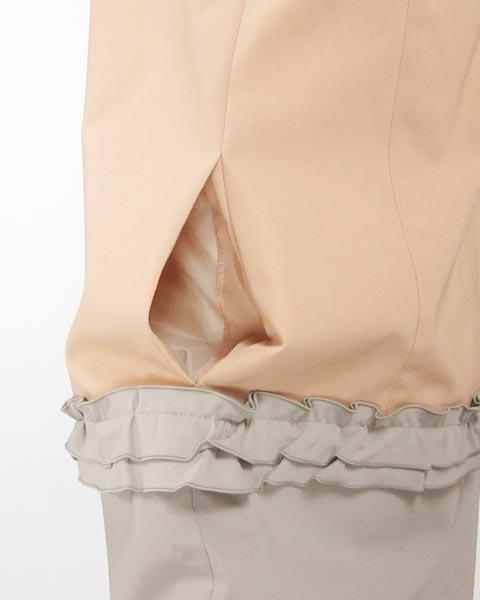 ローウエストで切替のバイカラーワンピース。切替部分には細かい2段フリルになっていて、可愛すぎない可愛らしさがあります。シーズン問わず着ていただけます。シンプルなラインで、あきのこないデザインです。