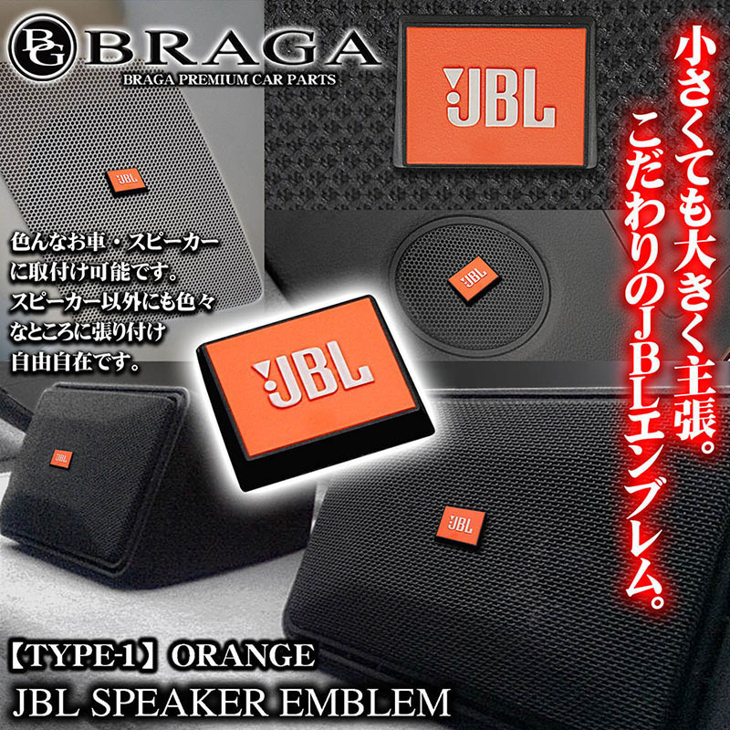 JBL 純正/タイプ1/オレンジ ホワイトロゴ ブラックボディ/スピーカーエンブレム 4個セット/両面テープ止/日本車 輸入車/ブラガ BG BRAGA
