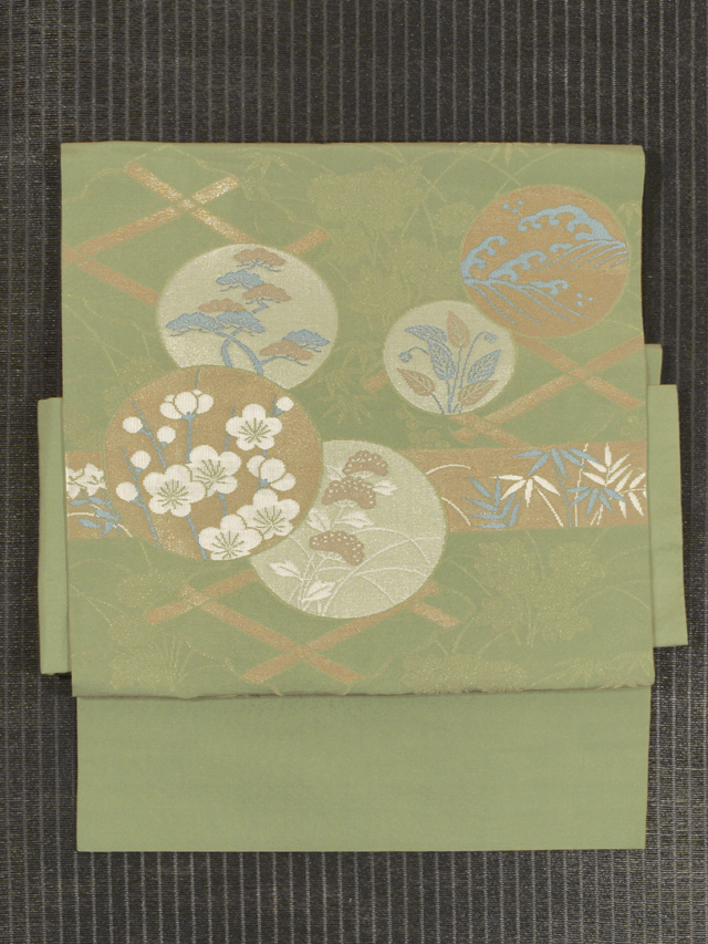 詳細  柳染(やなぎぞめ)色の地に、金糸で菊、梅、竹の草花の地紋と、垣(かき)の配された雲、松竹梅や女郎花(おみなえし)などの配された丸の文様が織り込まれている、西陣織の名古屋帯仕立ての付け帯で、胴回り部は額縁(がくぶち)仕立てになっています。お太鼓は手先が縫いついていますが、ご自身でつくっていただくタイプです。