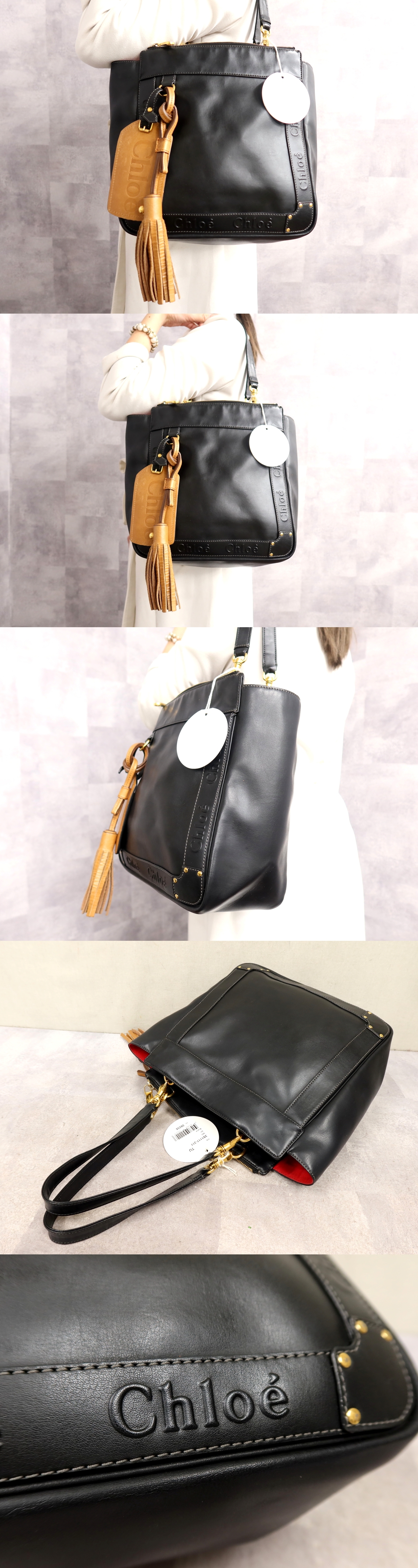 Store ●超美品●Chloe クロエ●エデン●タッセル●カーフ レザー 本革●トート バッグ●黒●ゴールド金具●肩掛け●A4 収納 かばん●Js65722