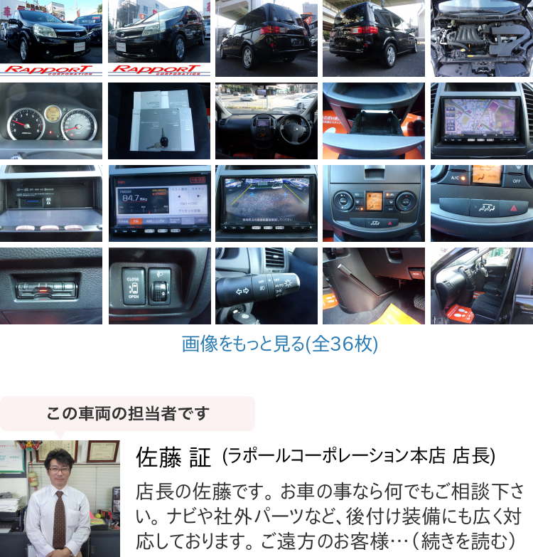 車両状態コメント内装:ワンオーナーで綺麗ですが、禁煙車かどうか判別出来ませんでしたので「B評価」と致しました。外装:板金塗装をしている箇所が何か所か御座います。濃色系のボディカラーですので小傷は御座います。第三者機関による鑑定済み車両で、内装:4つ星、外装:4つ星(修復歴無)の評価を頂戴しております。